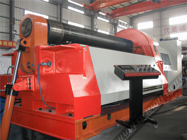 該W12數(shù)控四輥卷板機具有板材端部的預彎功能,能將金屬板材一次上料,不需調(diào)頭即可完成板端預彎和工件的卷制成形。該機上工作輥為主驅(qū)動輥,下輥和兩側(cè)輥的升降均采用液壓傳動,升降位移由計算機控制,自動調(diào)平,屏幕顯示,翻轉(zhuǎn)軸承體的傾倒和復位采用液壓傳動,上輥的尾部裝有平衡機構,可以方便卸出卷制后的工件及筒體。設有移動式Du立操作臺,可隨時移動操作,機器設有安全聯(lián)鎖裝置,該機技術水平高,功能全,精度高,操作方便。是能源、交通、石油、化工、鍋爐、造船、水電、金屬結(jié)構等行業(yè)卷制圓形、弧形和錐形工件理想的機型。