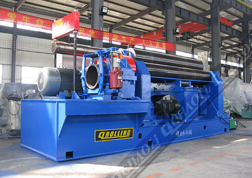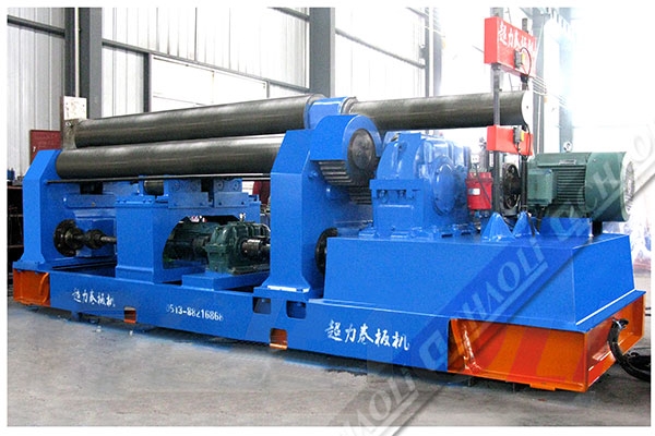 本機(jī)結(jié)構(gòu)型式為三輥對(duì)稱式,上輥在兩下輥中央對(duì)稱位置作垂直升降運(yùn)動(dòng),通過(guò)絲桿絲母蝸桿傳動(dòng)而獲得,兩下輥?zhàn)餍D(zhuǎn)運(yùn)動(dòng),通過(guò) 減速機(jī)的輸出齒輪與下輥齒嚙合,為卷制板材提供扭矩。本機(jī)床的缺陷是需借助其它設(shè)備實(shí)現(xiàn)預(yù)彎。本設(shè)備可卷板厚1mm-40mm,板寬8000mm的板料。
