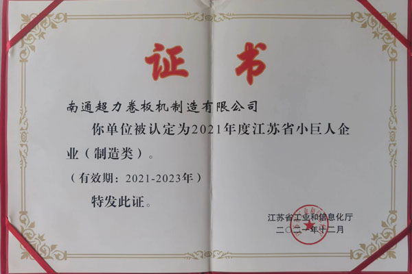 超力卷板機獲2021-2023年度江蘇省小巨人企業(yè)證書